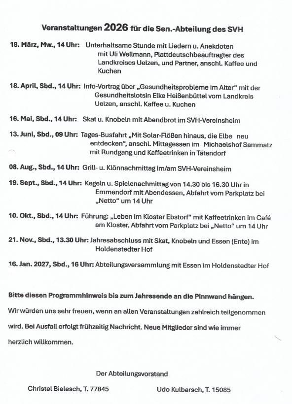 Wir würden uns sehr freuen, wenn an allen Veranstaltungen zahlreich teilgenommen wird. Bei Ausfall erfolgt frühzeitig Nachricht. Neue Mitglieder sind wie immer herzlich willkommen.